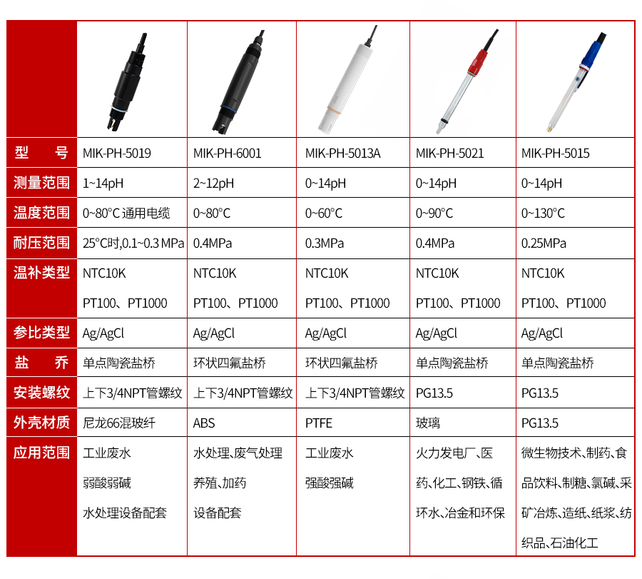 MIK-PH-6001为经济款塑壳电极,响应快、稳定性好,可根据客户需要加装各种温补型号PT100/PT1000/NTC 10K等。广泛应用于火电、化工化肥、冶金、环保、制药、生化食品和自来水等溶液中的PH值或ORP值和温度的连续监测。