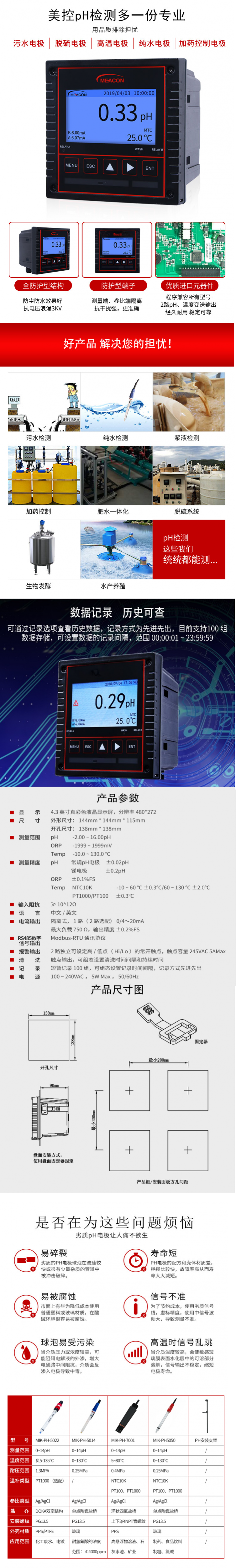 MIK-PH-6001为经济款塑壳电极,响应快、稳定性好,可根据客户需要加装各种温补型号PT100/PT1000/NTC 10K等。广泛应用于火电、化工化肥、冶金、环保、制药、生化食品和自来水等溶液中的PH值或ORP值和温度的连续监测。
