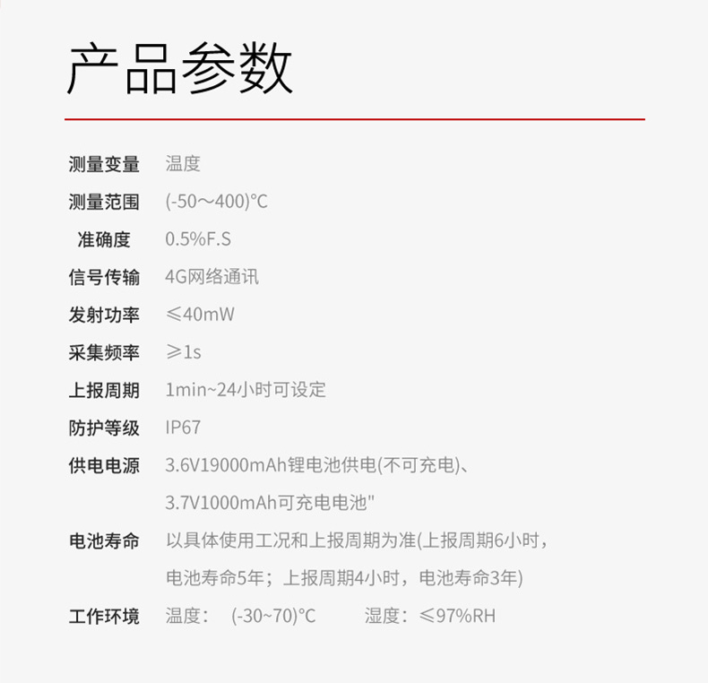 无线温度变送器是基于 4G 无线通讯网络使温度的测量、变送、上报为一体的低功耗智能仪表。产品采用 Pt100 温度传感器作为敏感元件,高精度信号调理电路,低功耗电池电源管理,丰富的 LCD 显示界面于一体,周期性上报温度测量值、电池电量、信号质量等数据,并且能够在温度超出设置范围时及时报警,提前预警故障隐患。 本产品适合油田、水利、消防管网、自来水管网、城市供热管网等智慧城市应用场景。