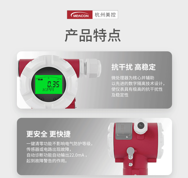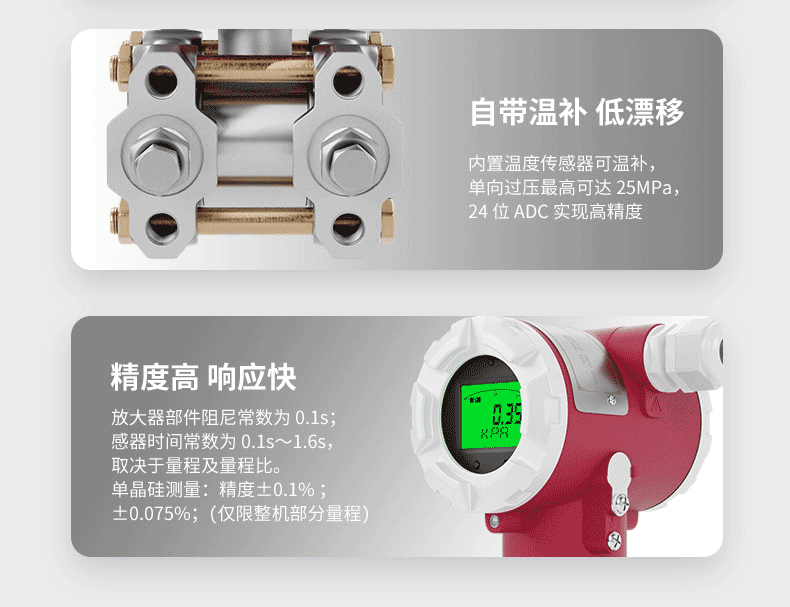 本款单晶硅压力/差压变送器。变送器在电路设计上采用以微处理器为核心并辅助以先进的数字隔离技术的模块化设计,使仪表具有极高的抗干扰性及稳定性,同时通过内置温度传感器对变送器进行补偿,提高了测量精度,降低了温度漂移,具有长期稳定性好,可靠性高,自诊断能力强等特点。