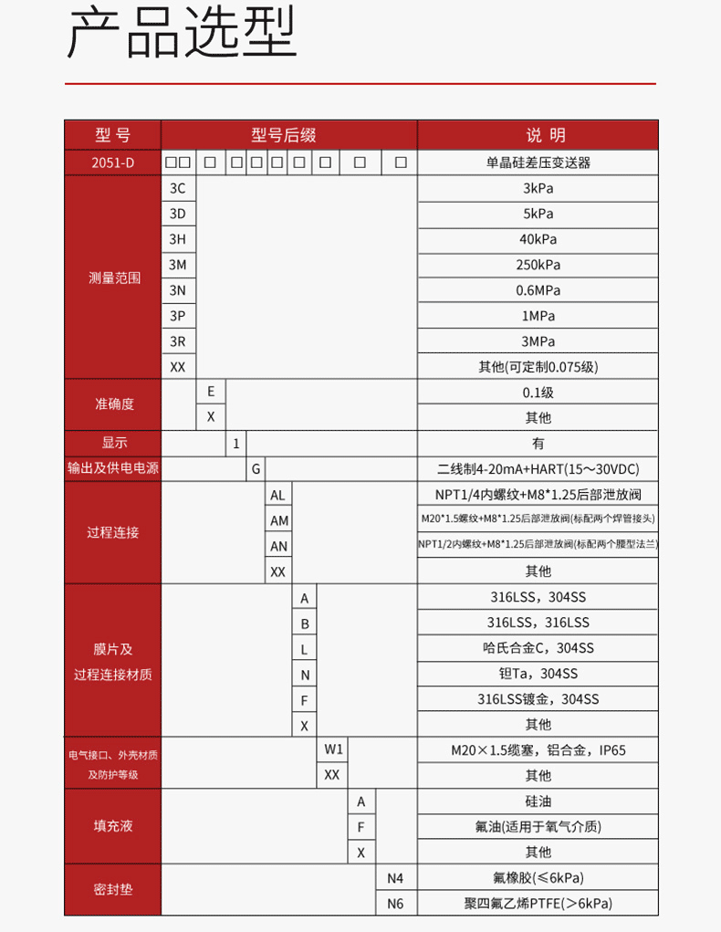 本款单晶硅压力/差压变送器。变送器在电路设计上采用以微处理器为核心并辅助以先进的数字隔离技术的模块化设计,使仪表具有极高的抗干扰性及稳定性,同时通过内置温度传感器对变送器进行补偿,提高了测量精度,降低了温度漂移,具有长期稳定性好,可靠性高,自诊断能力强等特点。在结构上,用户很方便的通过 HART 通讯手操器对变送器进行标定、设置和组态;广泛应用于石油、化工、电力、冶金、水务、酿造等工业领域。