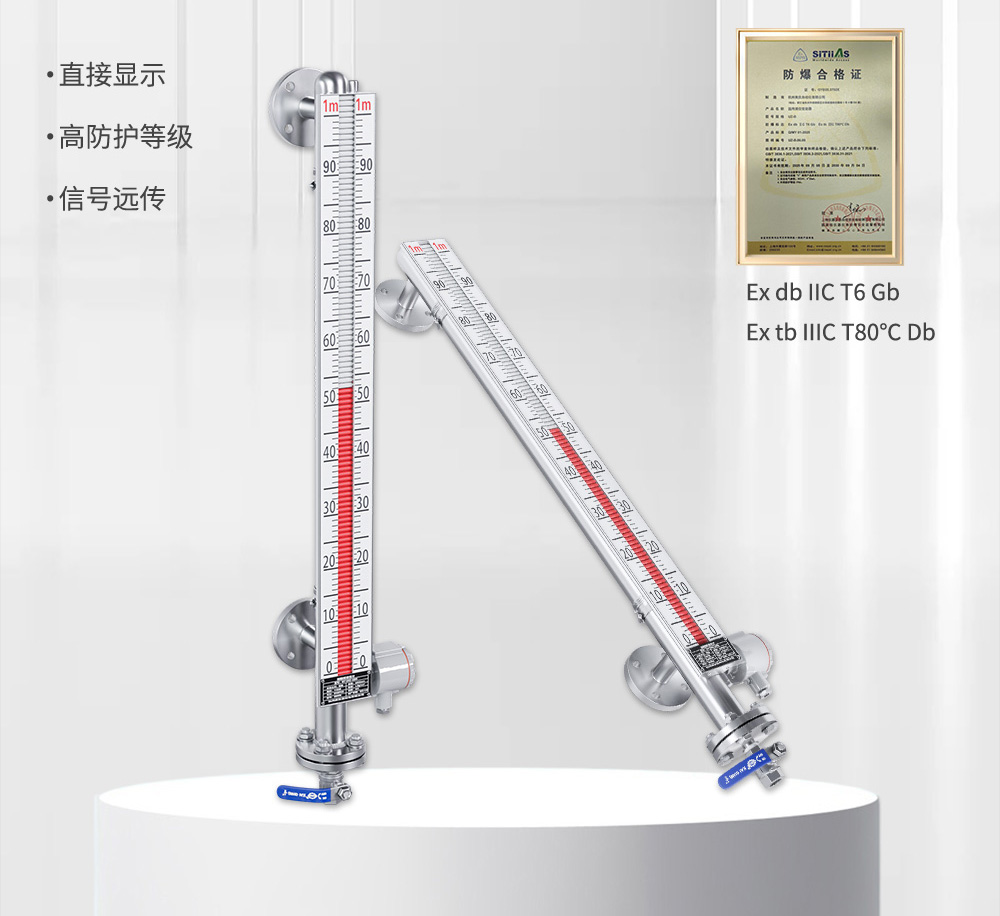 在液位计的主体上安装变送器,可以实现远传显示,变送器由传感器和转换器两部分组成,传感器通过磁浮子上下移动,经磁耦合作用使导管内干簧管(或磁传感器)依次动作,获得电阻信号变化,转换成(4~20)mA 的标准电流信号输出。在液位计主体上安装报警开关,可实现报警或联锁控制。适用于低温到高温、真空到高压等各种环境,是石油化工等行业理想的液位测量产品。