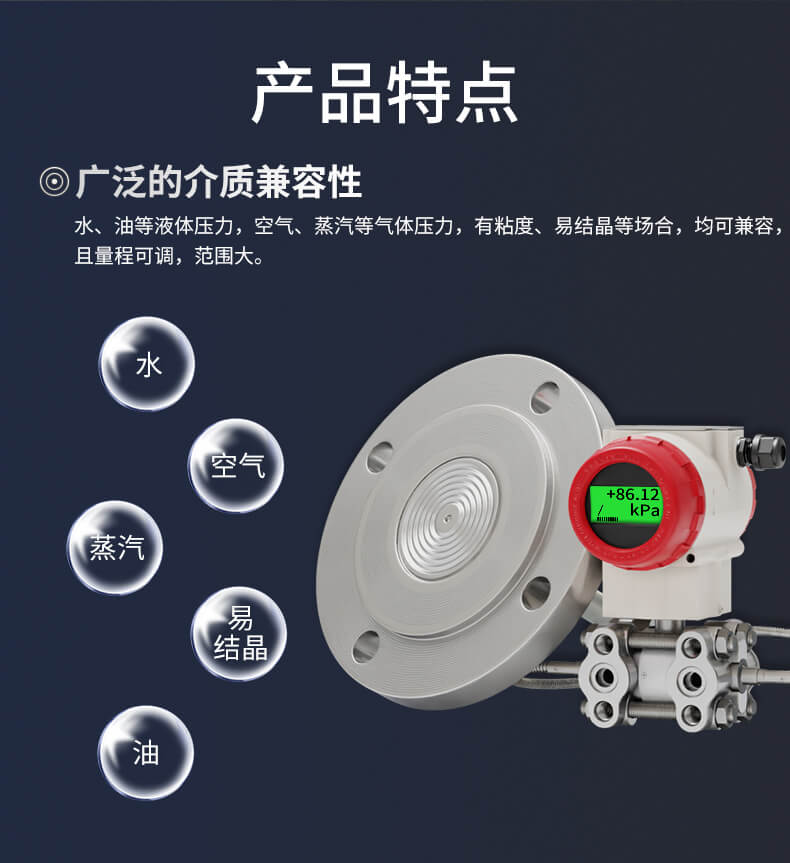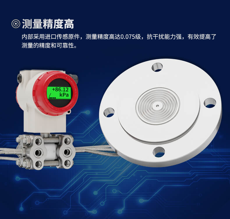 J9.COMMIK-3051DP双法兰液位变送器产品利用差动电容检测原理,当两侧压力不一致时,致使容室中测量膜片产生位移,其位移量与压力差成正比,通过电路处理将电容变化量转换成4~20mA的二线制电流信号输送给二次仪表显示液位值,同时也可以表头显示液位值。该液位变送器具有坚固抗振、量程、零点和阻尼现场连续可调。